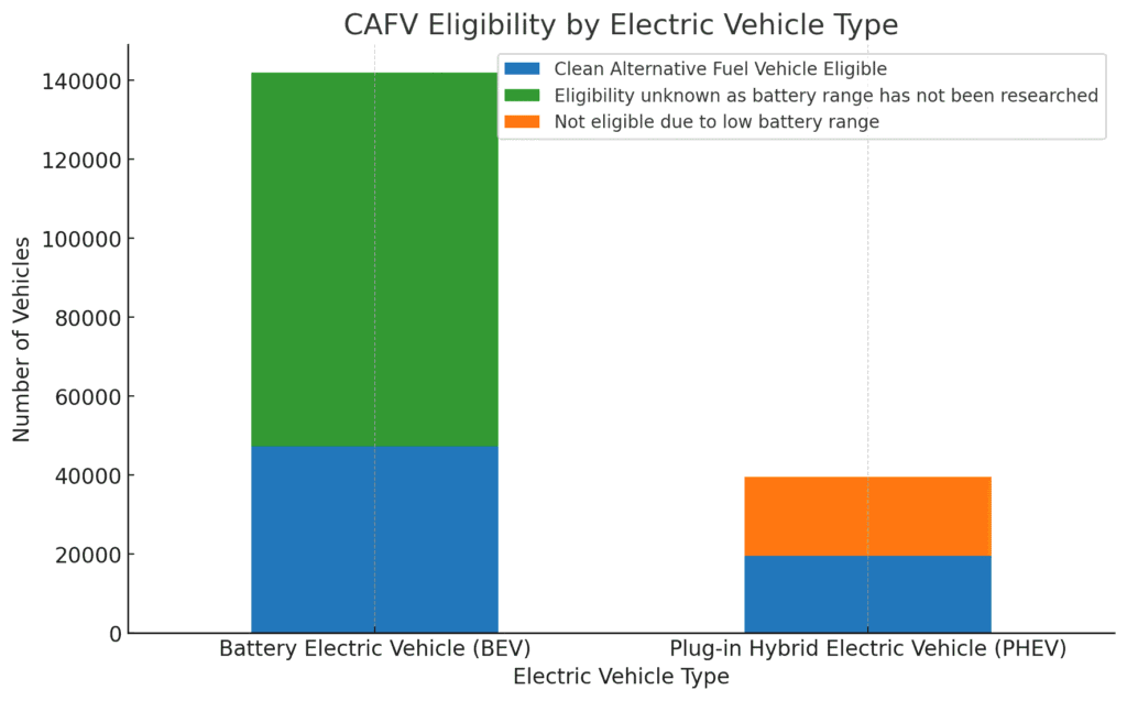 - PHEVs: A smaller proportion is eligible for CAFV incentives, likely due to their lower electric-only range and partial reliance on gasoline.