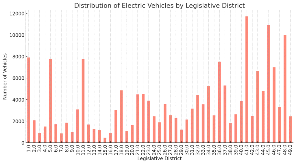 The bar chart displays the distribution of electric vehicles across different legislative districts in Washington State.