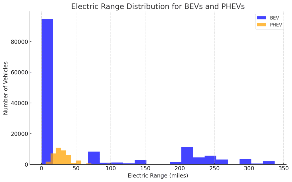 The histogram compares the electric range distribution between Battery Electric Vehicles (BEVs) and Plug-in Hybrid Electric Vehicles (PHEVs).