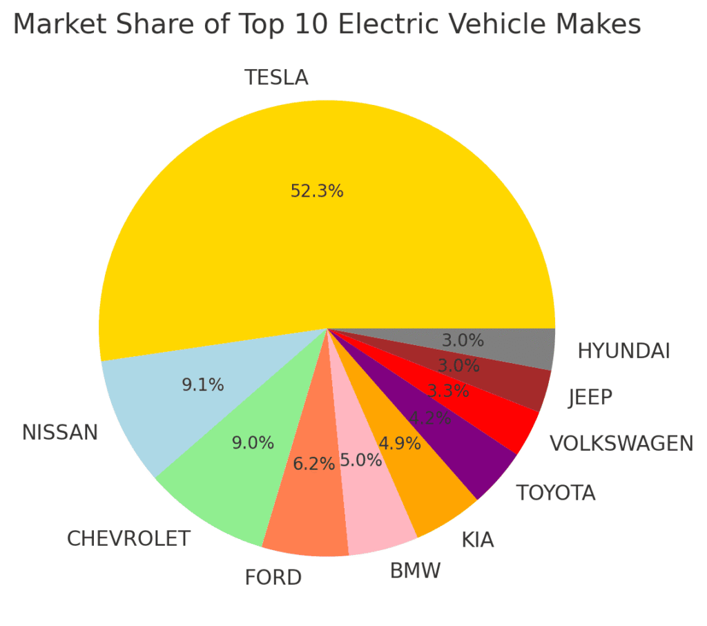 Other manufacturers like Nissan, Chevrolet, and Ford have significantly smaller shares, indicating Tesla’s strong position in the EV market.