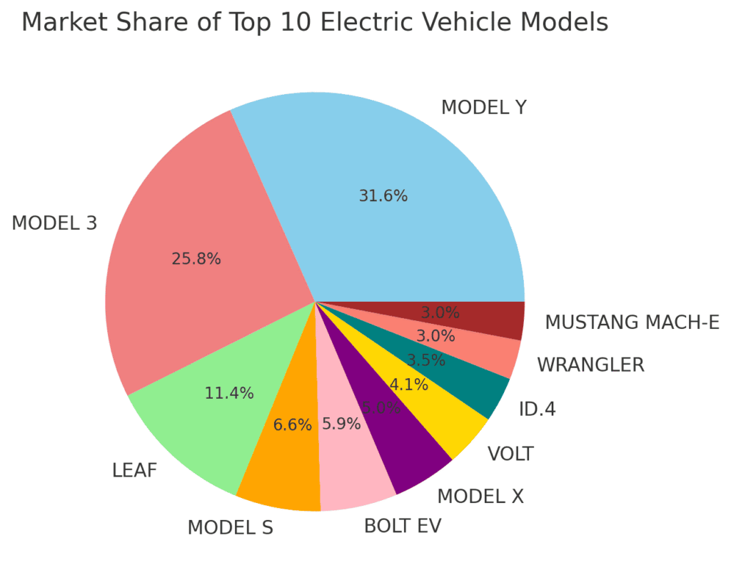 Tesla’s dominance is evident, with the Model Y and Model 3 together capturing over 37% of the market.
