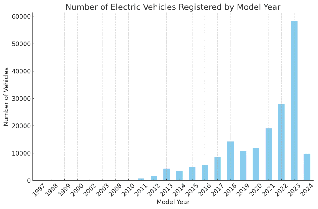 As our analysis reveals, electric vehicle adoption in Washington State is on a rapid upward trajectory, driven largely by the increasing popularity of Battery Electric Vehicles (BEVs) and the dominance of leading manufacturers like Tesla.