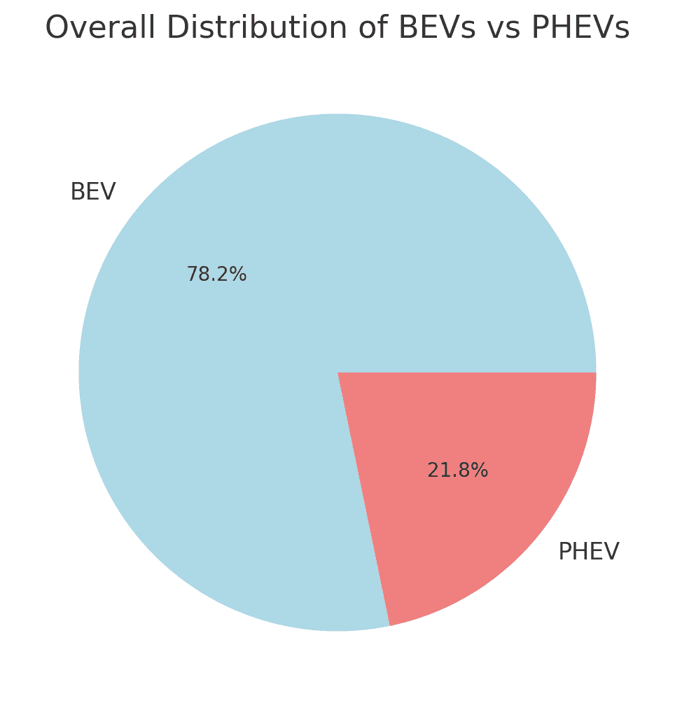 BEVs make up the majority of the electric vehicles, with nearly four times as many BEVs as PHEVs. This reflects a stronger preference for fully electric vehicles compared to hybrids that still rely on gasoline.