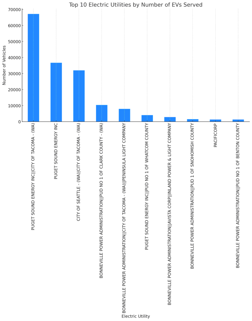 Utilities like Puget Sound Energy and City of Seattle – Seattle City Light are among the largest providers for EVs, which is expected given their service areas include major urban centres with higher EV adoption rates.