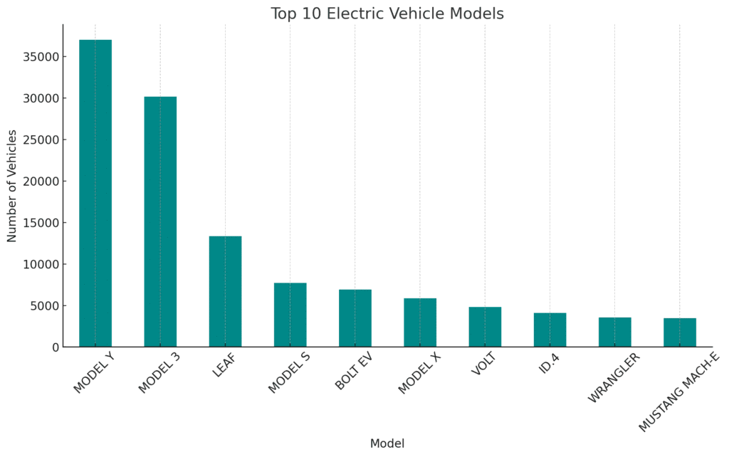 - Top Models: Tesla models, particularly the Model 3 and Model S, are the most popular, followed by other models like the Nissan Leaf and Chevrolet Volt.