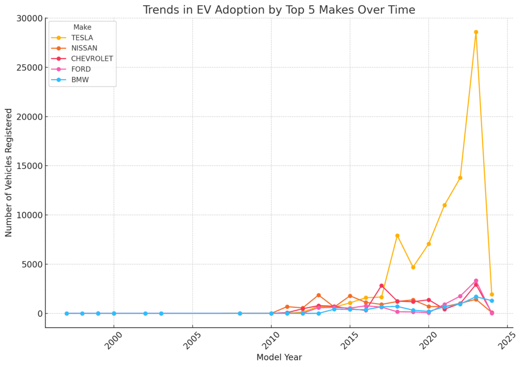 The line chart shows the trends in electric vehicle adoption over time for the top 5 makes: Tesla, Nissan, Chevrolet, Ford, and BMW.