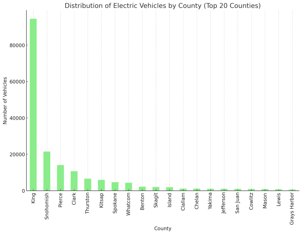 This provides a more detailed view of where EV adoption is concentrated, with King County leading by a significant margin, followed by other populous counties such as Snohomish, Pierce, and Clark.