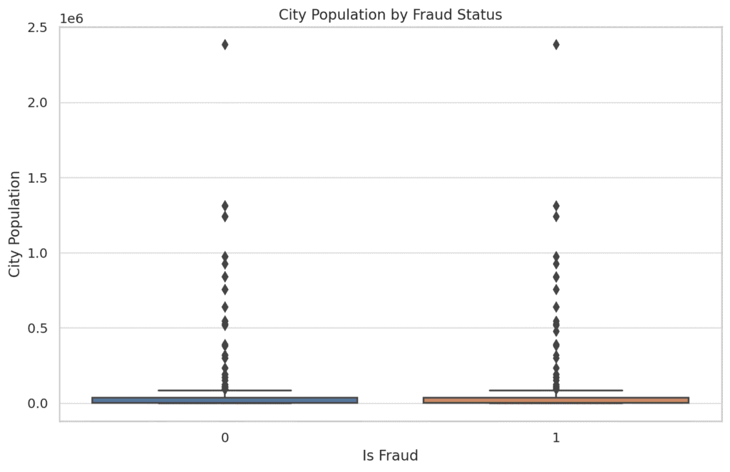 Fraudulent transactions are more likely to occur in cities with smaller populations. This could imply that fraudsters might be targeting less populated areas, possibly due to less stringent security measures.