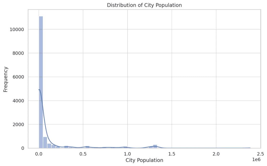 The city population distribution is heavily right-skewed, indicating that most transactions occur in smaller cities, with a few taking place in larger cities.