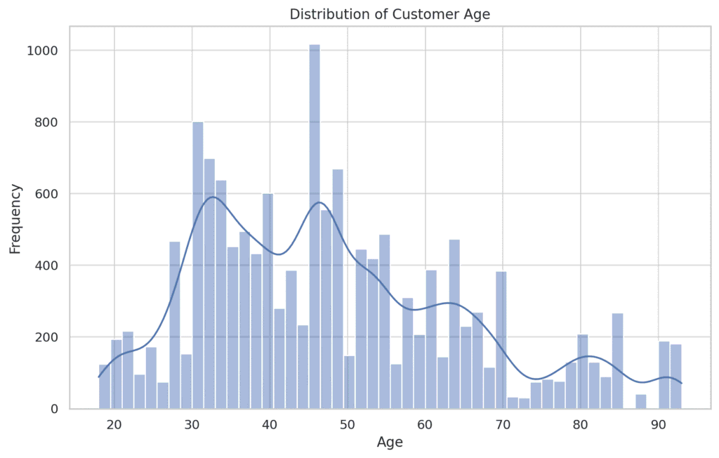 The age distribution shows a concentration of customers in the middle age range, with fewer younger and older customers. This distribution appears to be slightly left-skewed.