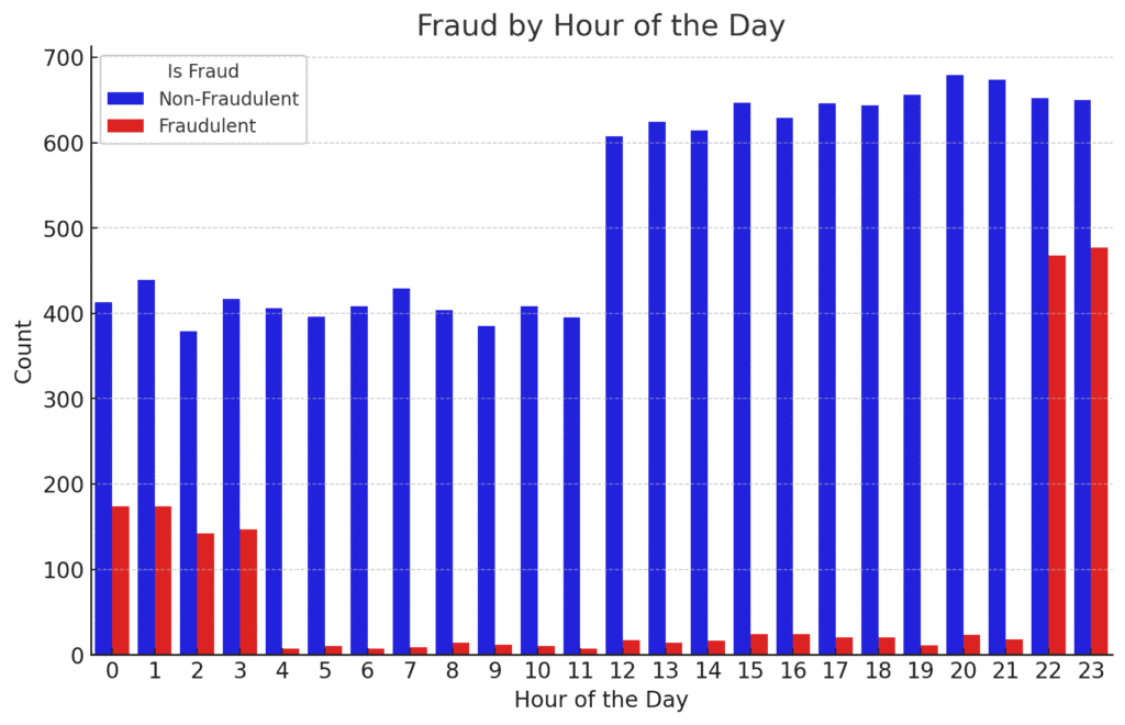 Fraudulent transactions are more frequent during certain hours, particularly late at night and early in the morning.
