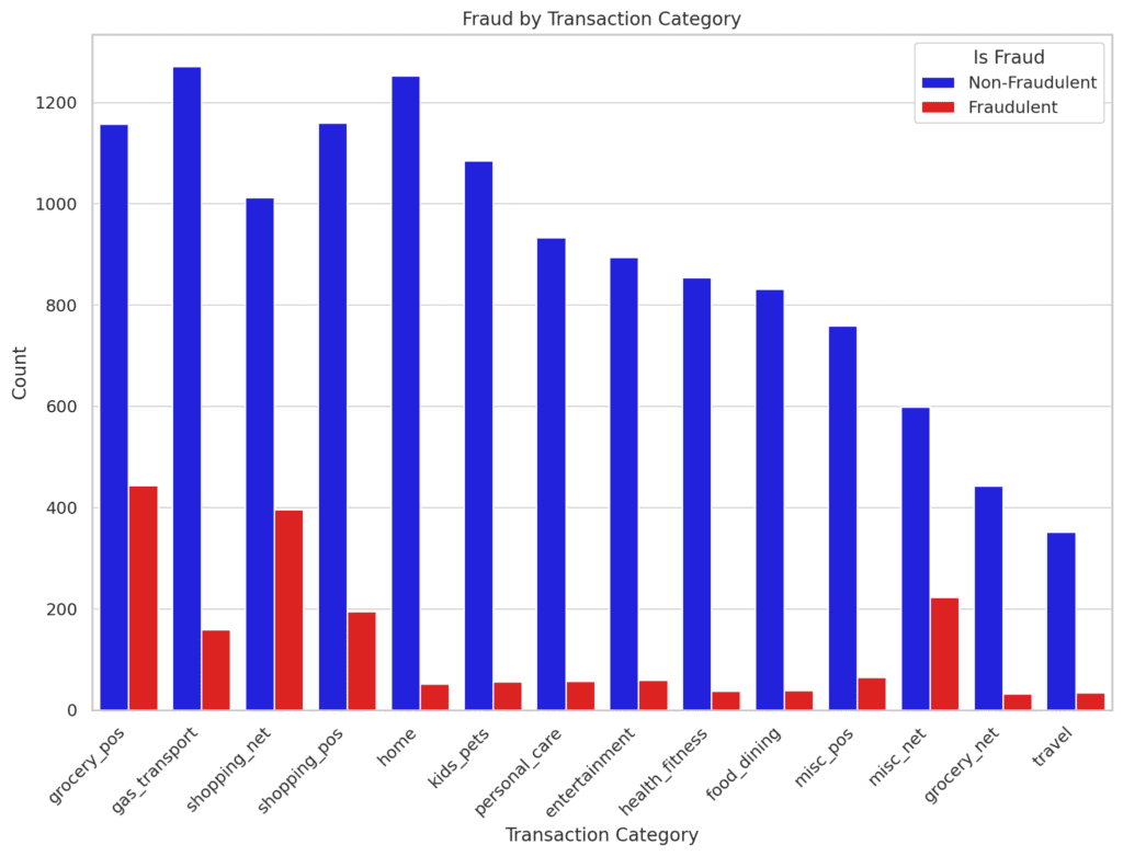 Let’s examine the distribution of fraud across different transaction categories to identify which categories are more vulnerable to fraudulent activity.