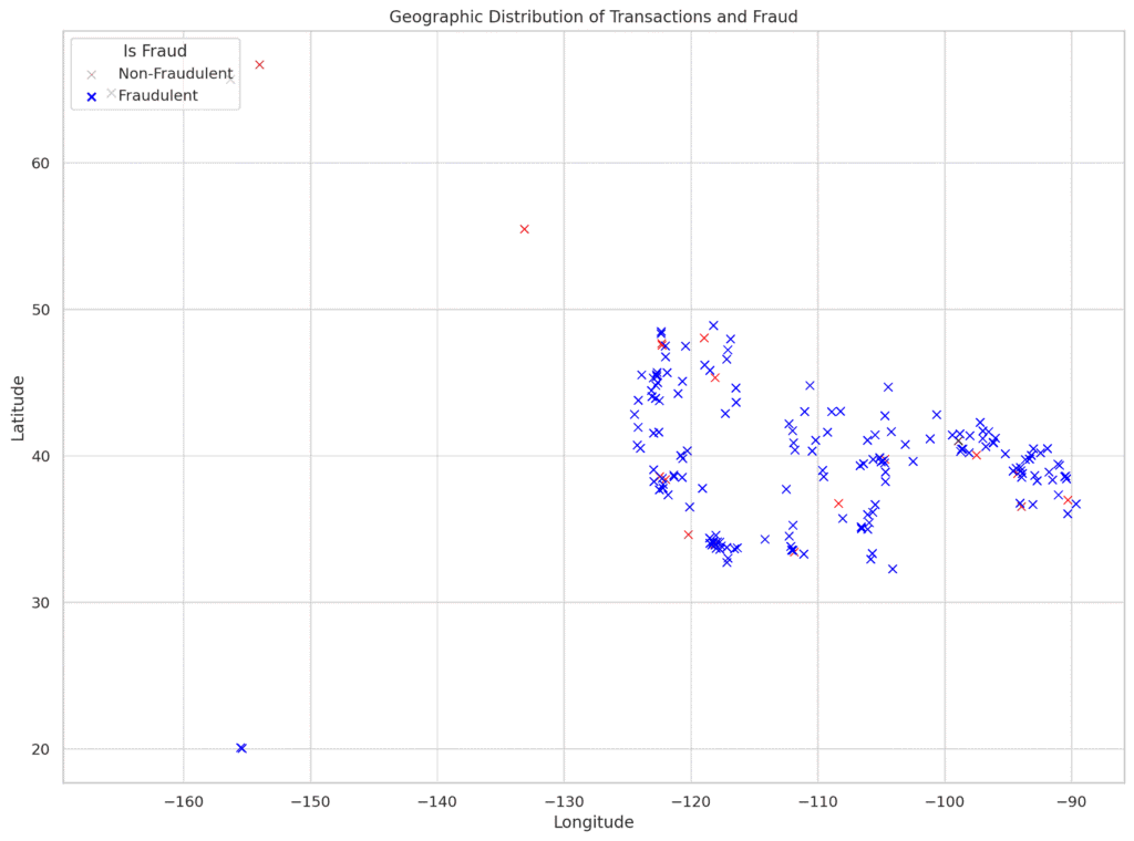 Non-fraudulent transactions (marked in blue) are distributed more evenly across the map. The overlap between fraudulent and non-fraudulent transactions indicates that fraud does not exclusively occur in isolated areas but rather within regions of regular transaction activity.