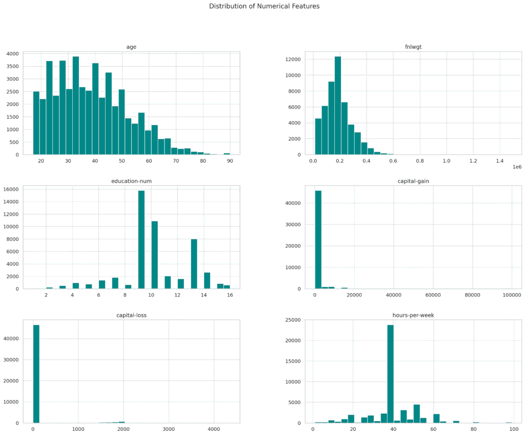• capital-gain and capital-loss: These distributions are highly skewed, with many individuals having zero gains or losses.