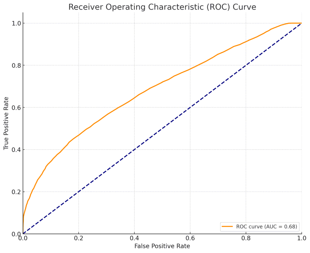 AUC Value: The AUC value of 0.68 reported on the curve indicates the overall ability of the model to distinguish between the two classes.