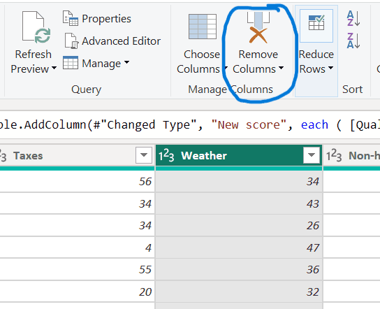 - Select the ‘Weather’ column and remove it by clicking ‘Remove Columns’ from the Home tab.