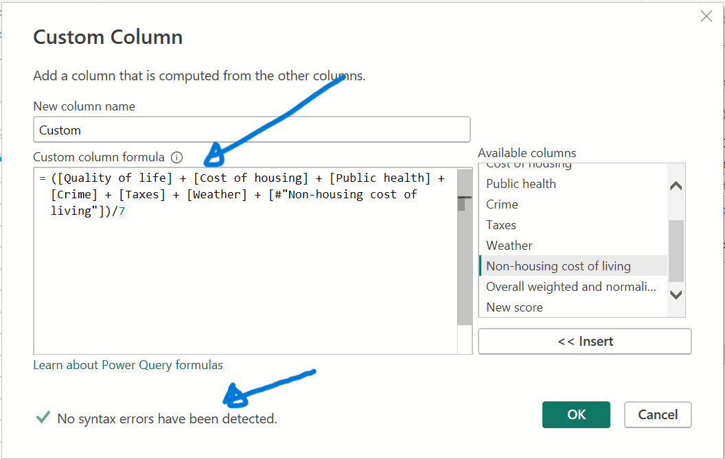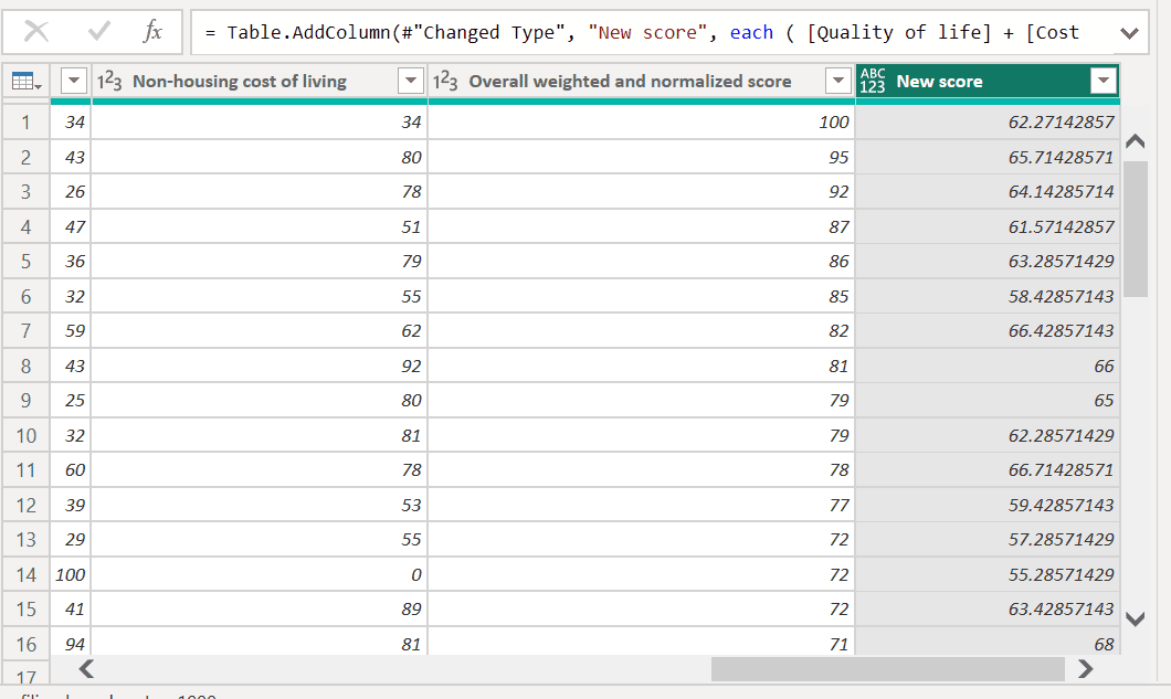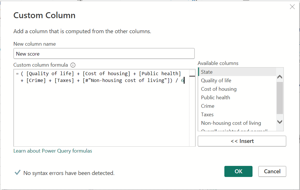- In the Custom Column dialog box, enter ‘New score’ as the column name (or any other name you prefer) and provide the desired formula as shown below.