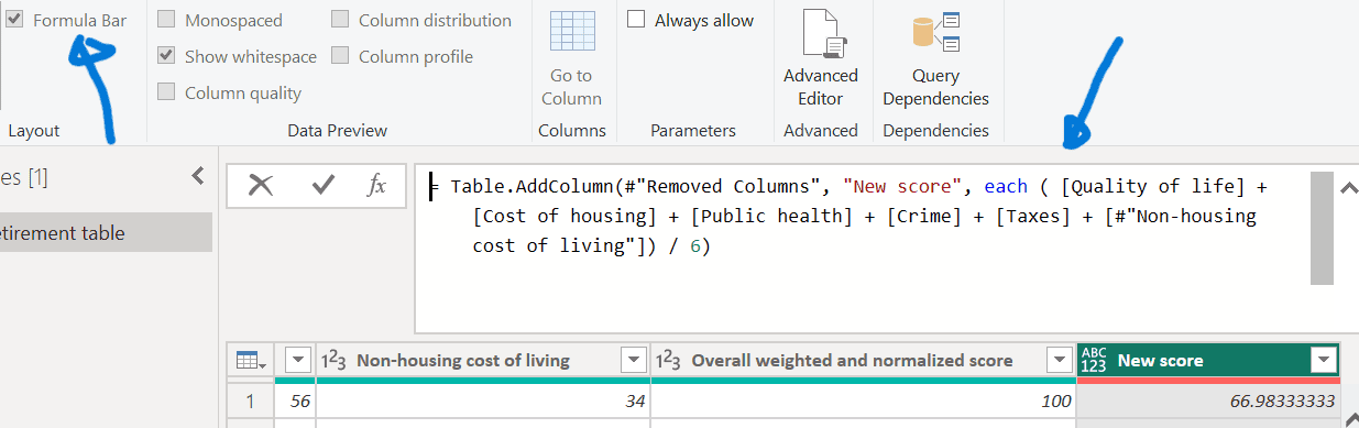 - Select the New score column, then enable the Formula Bar checkbox from the View tab to display the column’s data formula.