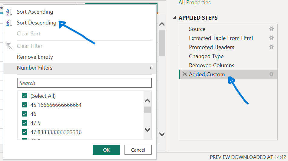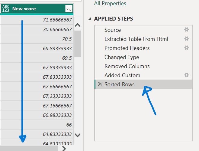 - Select the last Applied Step, Sorted Rows.