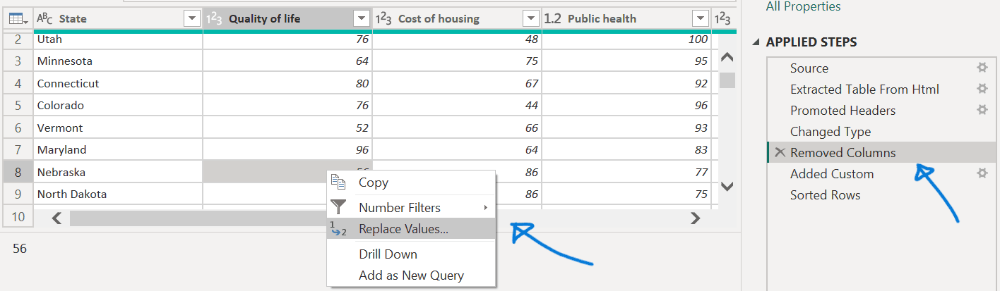 - Right-click the cell with Nebraska value Quality of life ranking.