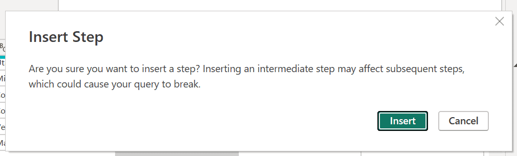 Power Query Editor notifies us that subsequent steps might break the query as we’re inserting a new step.