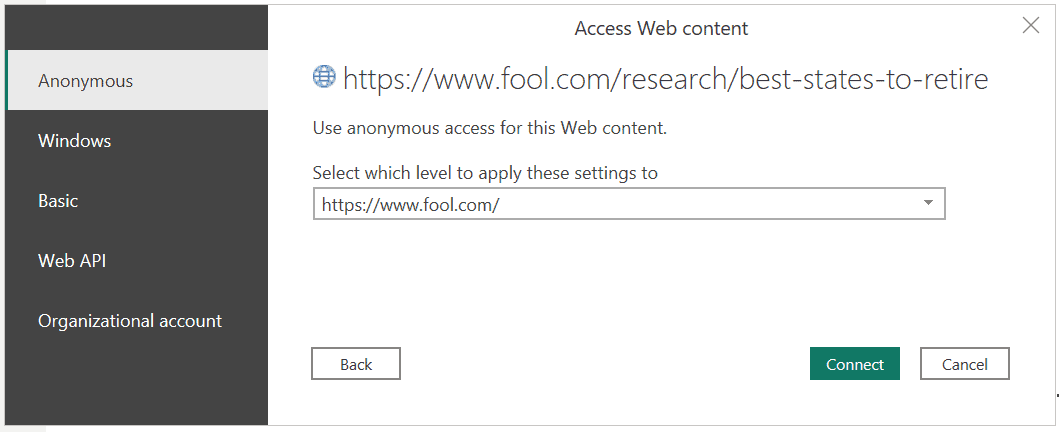 3. If prompted, select ‘Anonymous Access’ to connect to the web content and click ‘Connect.’
